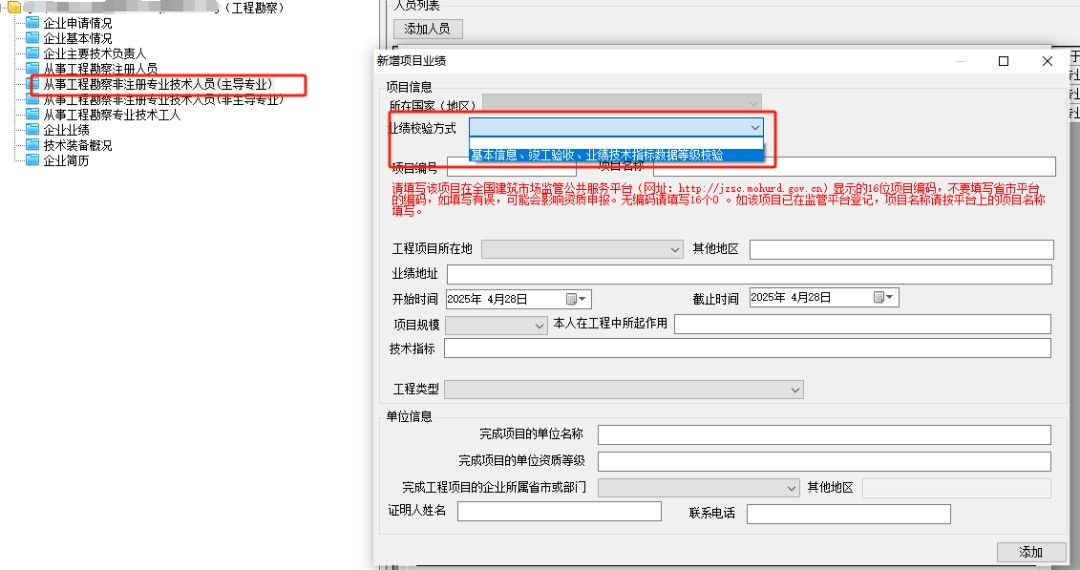 針對4月28日更新的系統(tǒng)顯示,從之前的3種校驗方式調(diào)整為2種校驗方式,對于要求平臺業(yè)績的資質(zhì)類型, 企業(yè)業(yè)績和人員業(yè)績最新的界面要求分別是: