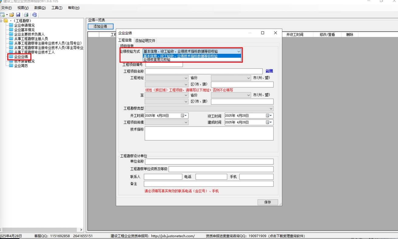 勘察資質(zhì)3個界面:基本信息,竣工驗收,業(yè)績技術(shù)指標(biāo)