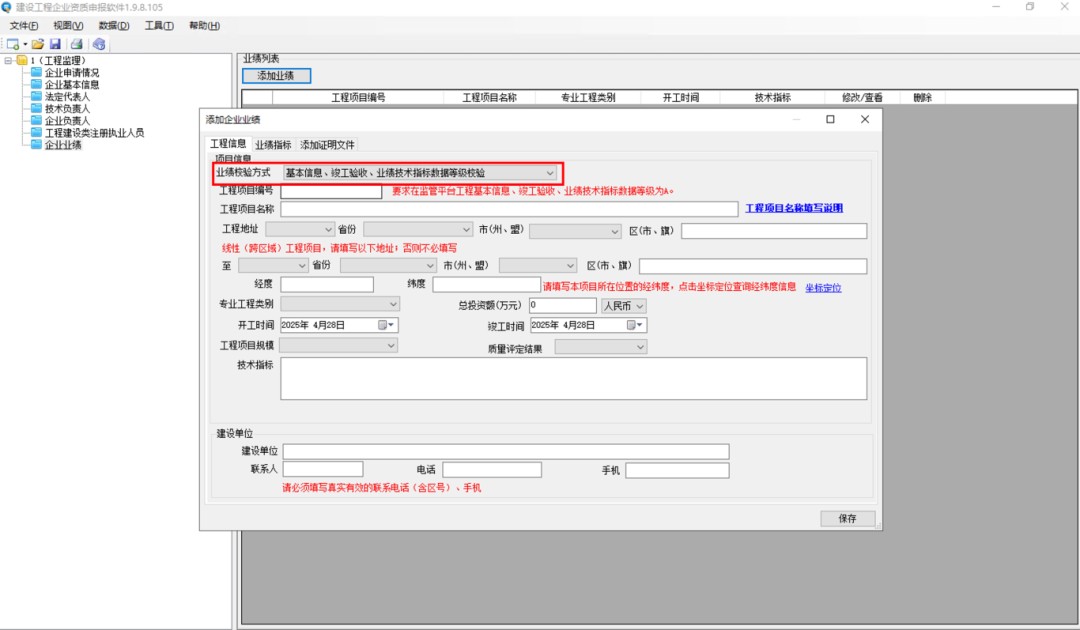 監(jiān)理資質(zhì)3個界面:基本信息,竣工驗收,業(yè)績技術(shù)指標(biāo)